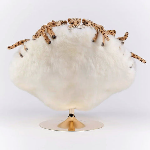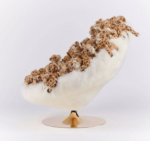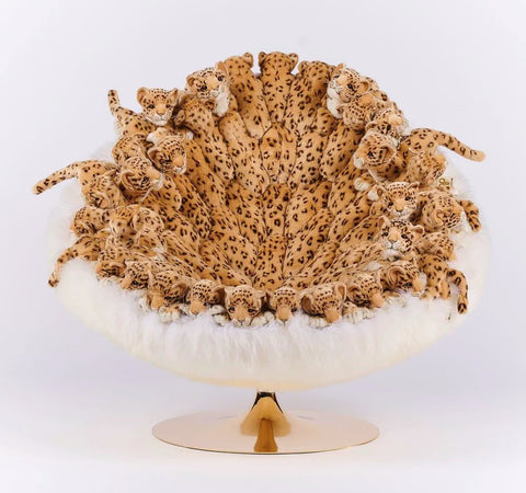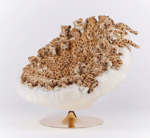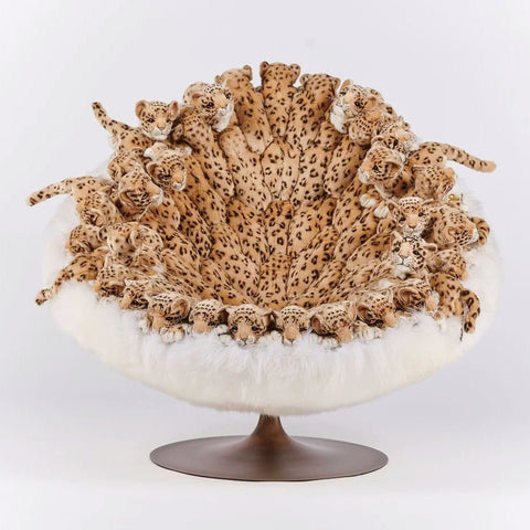 Each chair is meticulously handmade, ensuring that no two are exactly alike. The chair's structure combines various materials, including polyester plush, metal, wood, textile fabrics, and New Zealand sheepskin, to create a luxurious and durable seating experience. The plush leopard figures are carefully crafted to add texture and visual interest, making the chair a standout piece in any interior.