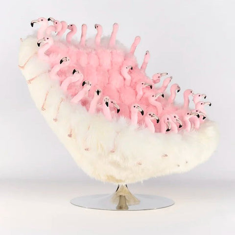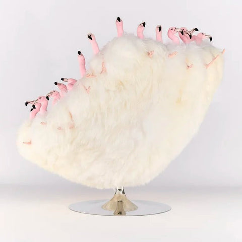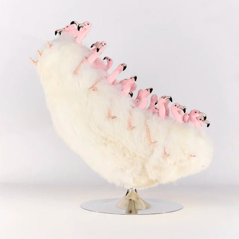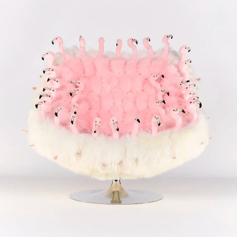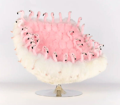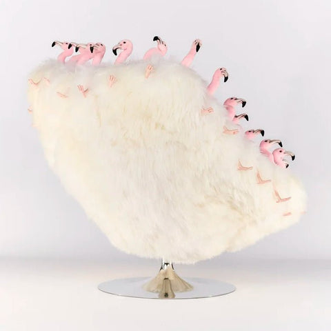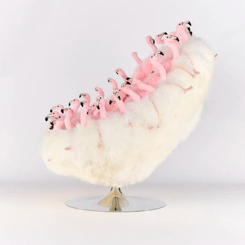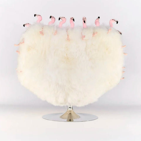 Each chair is meticulously handmade, ensuring that no two are exactly alike. The chair's structure combines various materials, including polyester plushes, metal, wood, textile fabrics, and New Zealand sheepskin, to create a luxurious and durable seating experience. The plush flamingo figures are carefully crafted to add texture and visual interest, making the chair a standout piece in any interior.