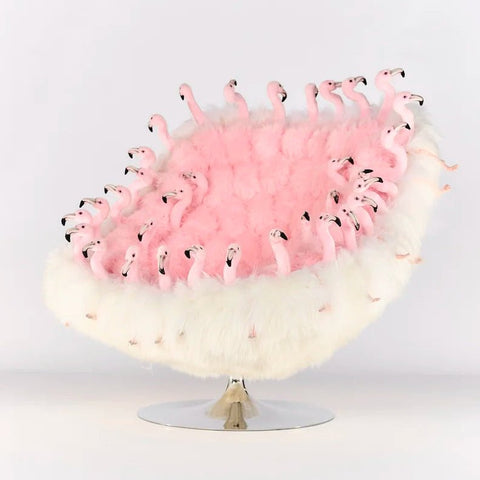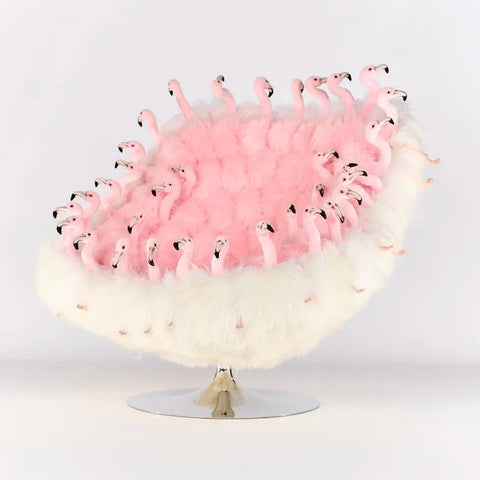 Materials: Handmade lounge chair adorned with various stuffed flamingos.  Metal disk base available in various finishes.  Handmade polyester plushes, metal, wood, textile fabrics, cowhide, and sheepskin, handmade in Belgium.  Swivel.