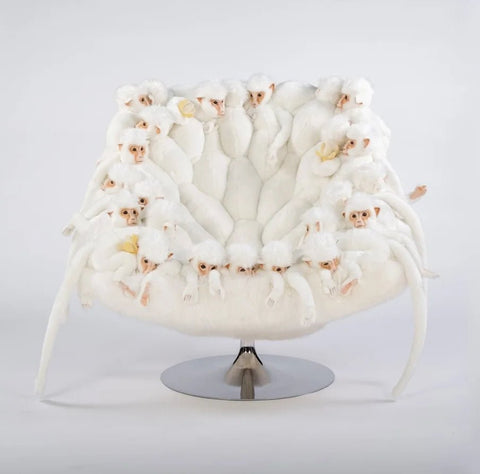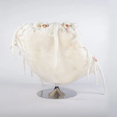 Materials: Handmade lounge chair adorned with various stuffed white monkeys.  Metal disk base available in various finishes.  Handmade polyester plushes, metal, wood, textile fabrics, cowhide, and sheepskin, handmade in Belgium.  Swivel.
