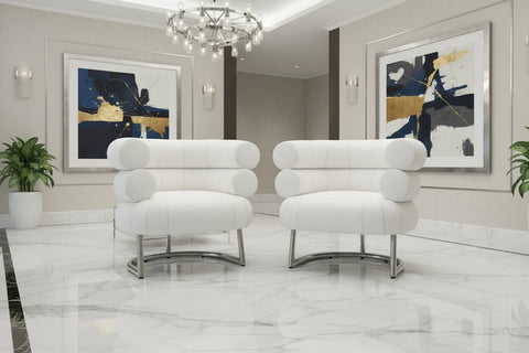The Eileen Gray Bibendum Chair was named by Gray herself when she saw the Michelin Tire company's iconic caricature. The Bibendum Chair joins the Adjustable Height Table as one of her most widely recognized designs. The Bibendum Chair has been attributed to the work Eileen Gray did in Paris for Suzanne Talbot's Rue de Lota project. The Eileen Gray Bibendum Chair is one of several designs that typify Gray's opulent take on the stark modernist aesthetic. Until her death, Eileen Gray was largely unrecognized, but she is now regarded as one of the most influential designers and architects of the 20th century.