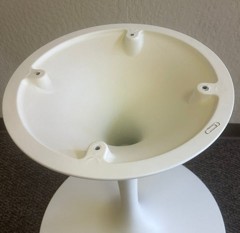 Offered on clearance is this dining-height matte white tulip base.   This large round base is used for tables 50" to 71" in diameter and can accommodate 400 lbs.+.   It has a small scrape to the top edge that will not impact performance. It includes a new white mounting plate.