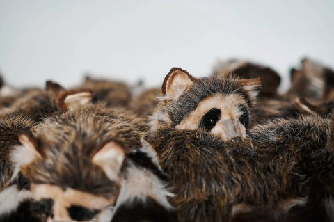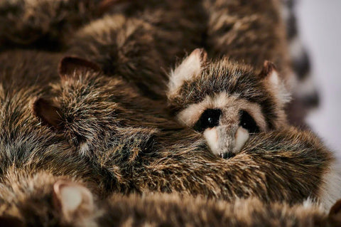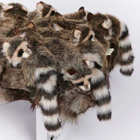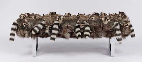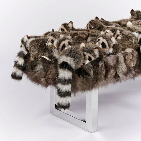 Materials: Handmade bench adorned with various stuffed raccoons.   Base in chromed steel. Handmade polyester plushes, metal, wood, textile fabrics, cowhide, and sheepskin, handmade in Belgium.