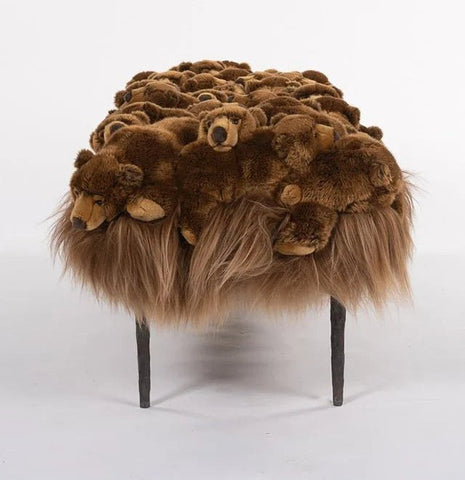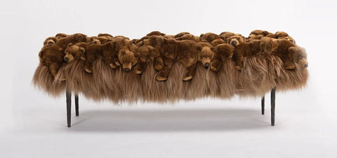Materials: Handmade bench adorned with various stuffed grizzly bears.   Base in steel. Handmade polyester plushes, metal, wood, textile fabrics, cowhide, and sheepskin, handmade in Belgium.