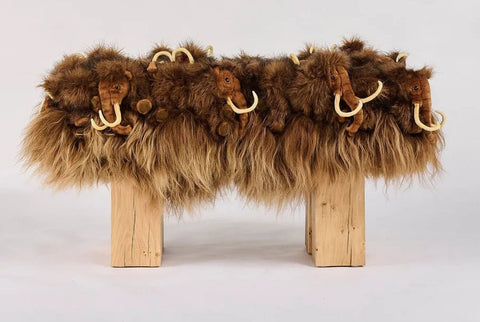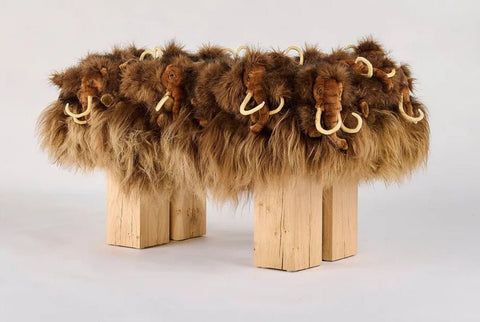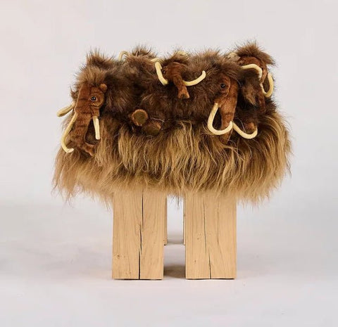 Materials: Handmade bench adorned with various stuffed woolly mammoths.   Base in solid natural oak.  Handmade polyester plushes, metal, wood, textile fabrics, cowhide, and sheepskin, handmade in Belgium.