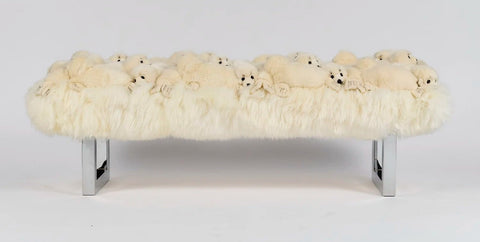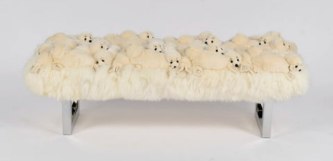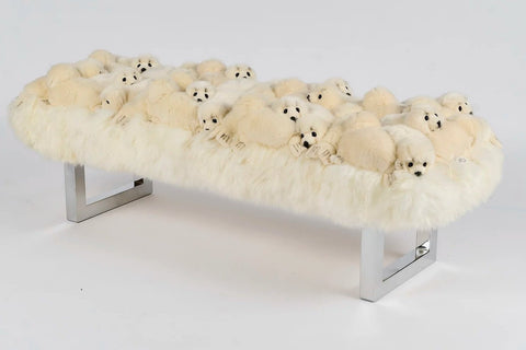 Materials: Handmade bench adorned with various stuffed white snow seals.   Base in chromed steel. Handmade polyester plushes, metal, wood, textile fabrics, cowhide, and sheepskin, handmade in Belgium.