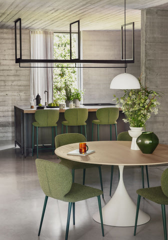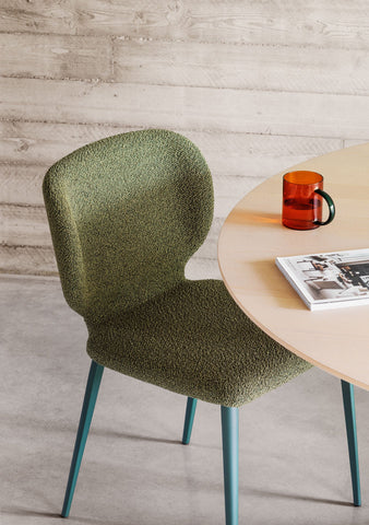 The Wrap Chair was designed by Balutto Associati for Midj in 2016.  The Wrap range is comprised of a side chair, a unique armchair, a lounge chair, and a stool.  Each uses a steel or wood base and is upholstered with fabric or leather.