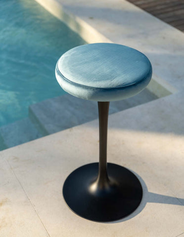 Materials: Stool with base in lacquered cast aluminum in white, black or grey. Cushion in expanded foam covered with fabric or leather.