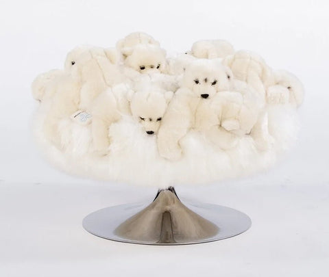 Materials: Handmade pouf adorned with various stuffed polar bears.  Metal disk base available in various finishes.  Polyester plushes, New Zealand sheepskin, metal, wood, and textile fabrics.  Swivel.