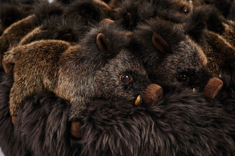 Materials: Handmade pouf adorned with various stuffed boars.  Metal disk base available in various finishes.  Polyester plushes, New Zealand sheepskin, metal, wood, and textile fabrics.  Swivel.