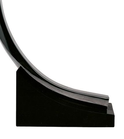 The lamp's striking design showcases a blend of materials and forms: a solid, painted-black wooden base supports an arching spine of chrome-plated metal, from which a swiveling hemispherical chrome shade is suspended. This vertical composition and use of modern materials are often seen as a tribute to the era's skyscraper architecture.
