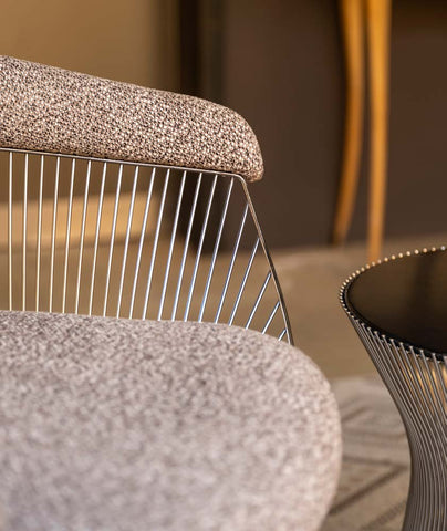 Working in the firms of Eero Saarinen and Kevin Roche in the early and mid-1960s, Platner unveiled his seminal collection of chairs, ottomans, and tables in 1966. Produced with a grant from the Graham Foundation, each piece rested on a sculptural base of nickel-plated steel rods resembling a “shiny sheaf of wheat.” Production was complicated. The sculptural bases were made of hundreds of rods; for some, chairs required more than 1,000 welds. An intricate, cylindrical mesh steel base created a unique architectural interplay between the interior and exterior spaces, supported by the upholstered seat.